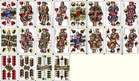 Beim deutschen Blatt sind die Farben Eichel, Grün, Rot und Schellen, die in dieser Reihenfolge Kreuz, Pik, Herz und Karo entsprechen. Die Unter ersetzen die Buben und die Ober die Damen. Das Ass wird häufig Daus, genannt.